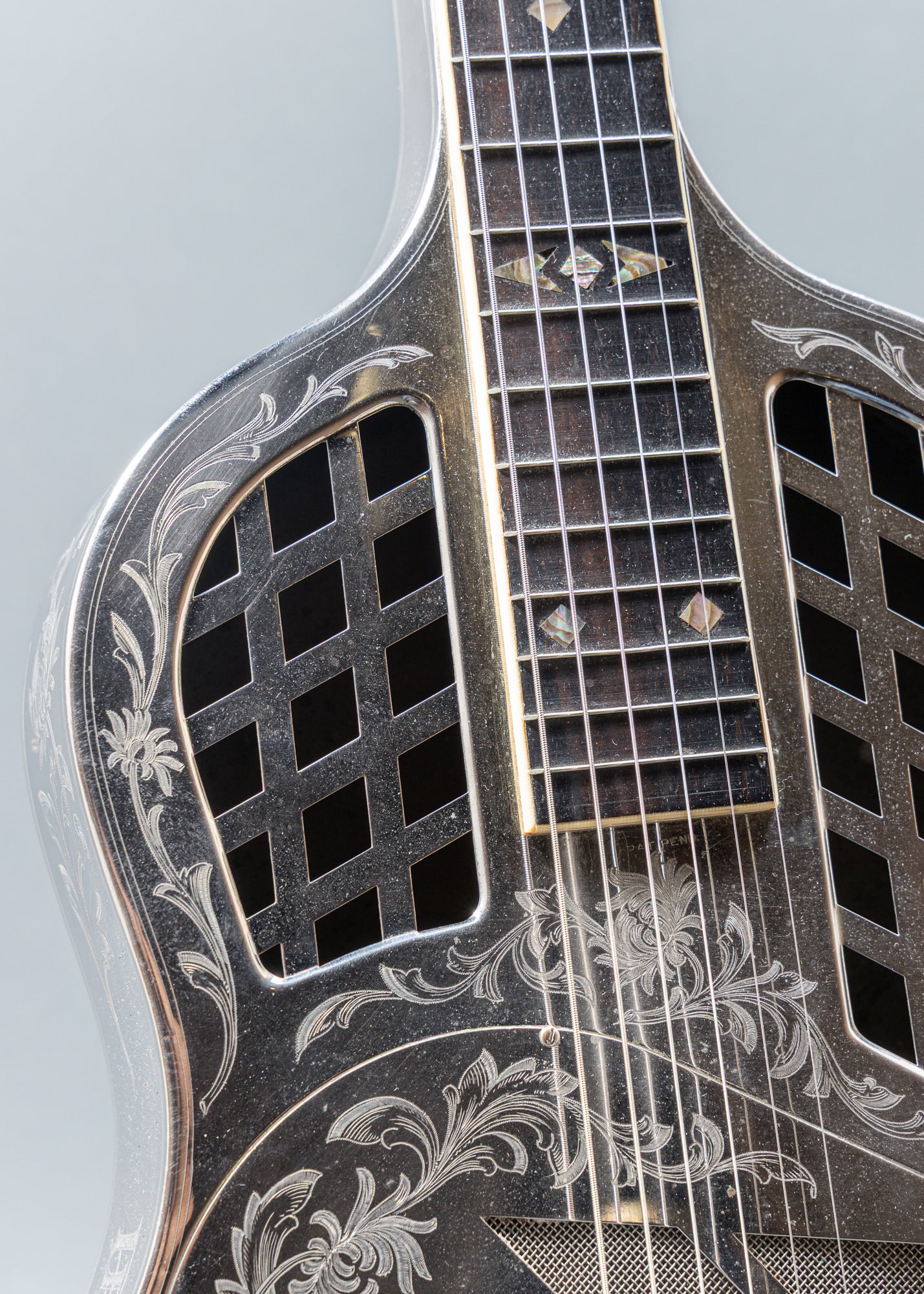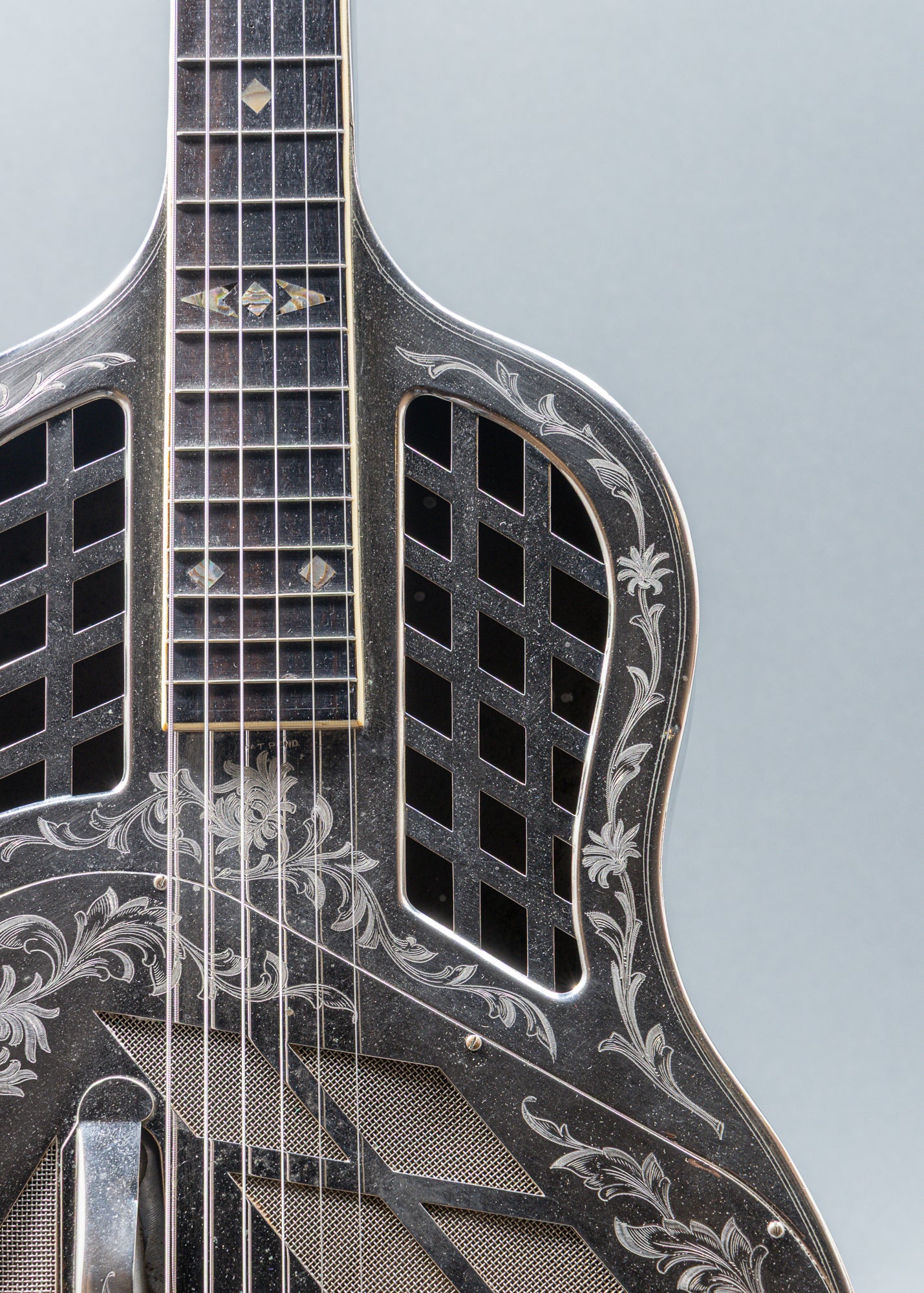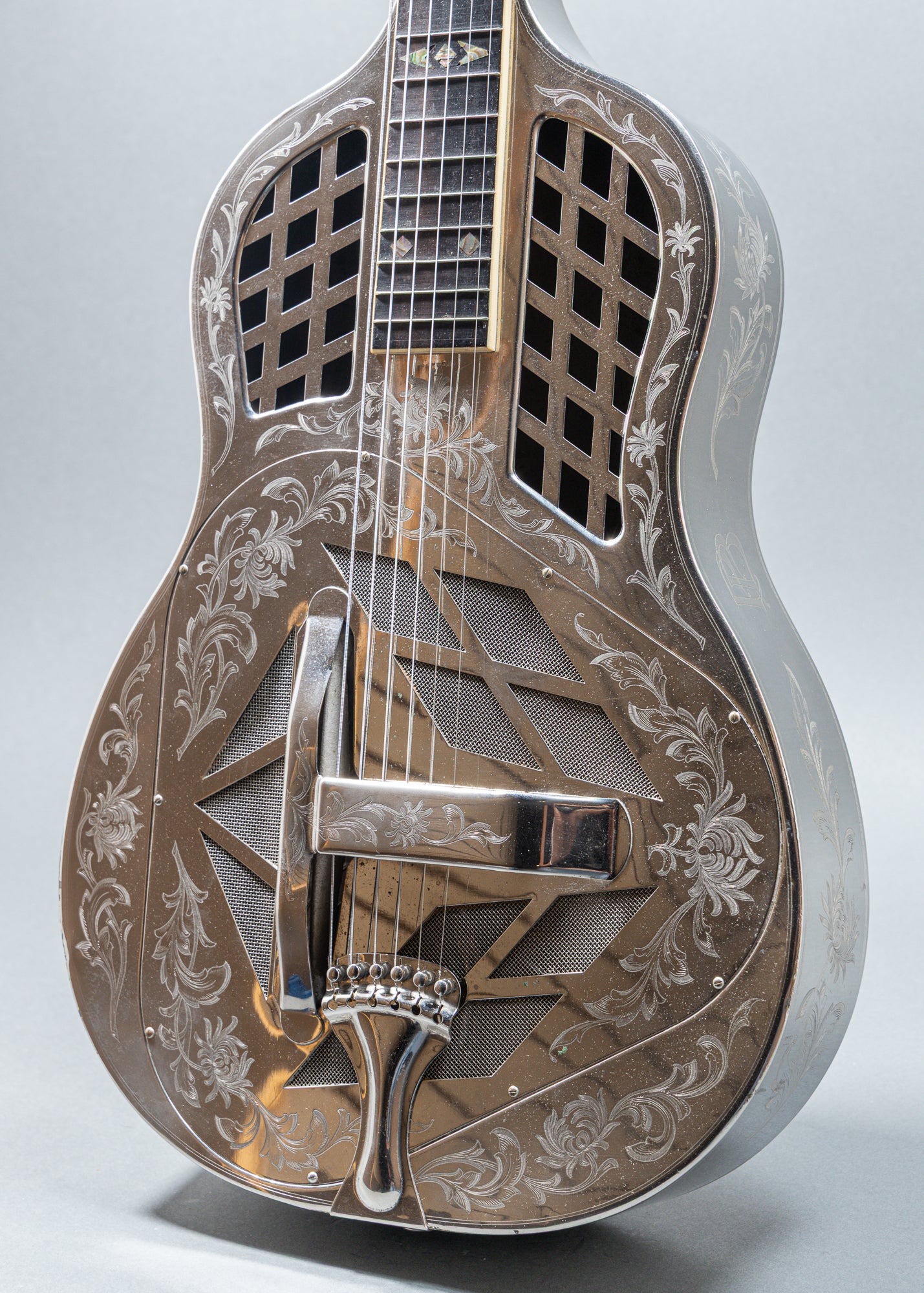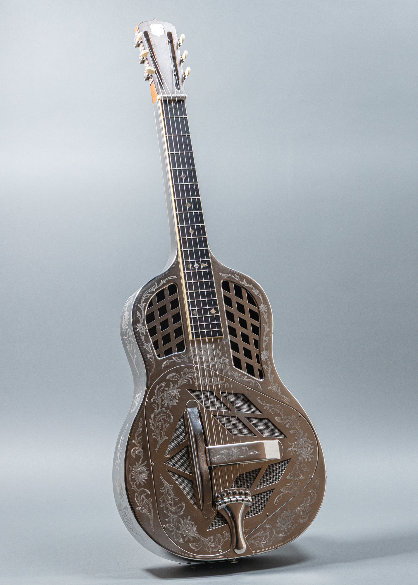 The National Style 4 Tricone Hawaiian, serial number 444, is a premier resonator guitar featuring a highly ornate, hand-engraved "Chrysanthemum" German silver body. This square-neck lap slide instrument was handcrafted in 1928 at the original National factory in Los Angeles, California. As an early production model, it belongs to the pioneering era of the "Tricone" system. While exact totals are unrecorded, Style 4s were the most expensive, top-tier models, with only a few hundred produced during the late 1920s.