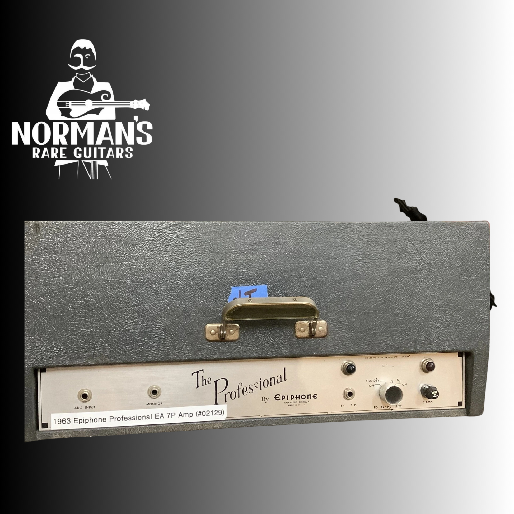 A 1963 Epiphone Professional Thinline Electric Guitar with the EA-7P amp is a rare, sold-as-a-package electric guitar and a 15-watt amplifier from the 1962-1966 production run. The amp has no independent controls; instead, all its features, such as tone, volume, tremolo, and reverb, are controlled by the guitar's knobs and switches via a multi-pin cable.