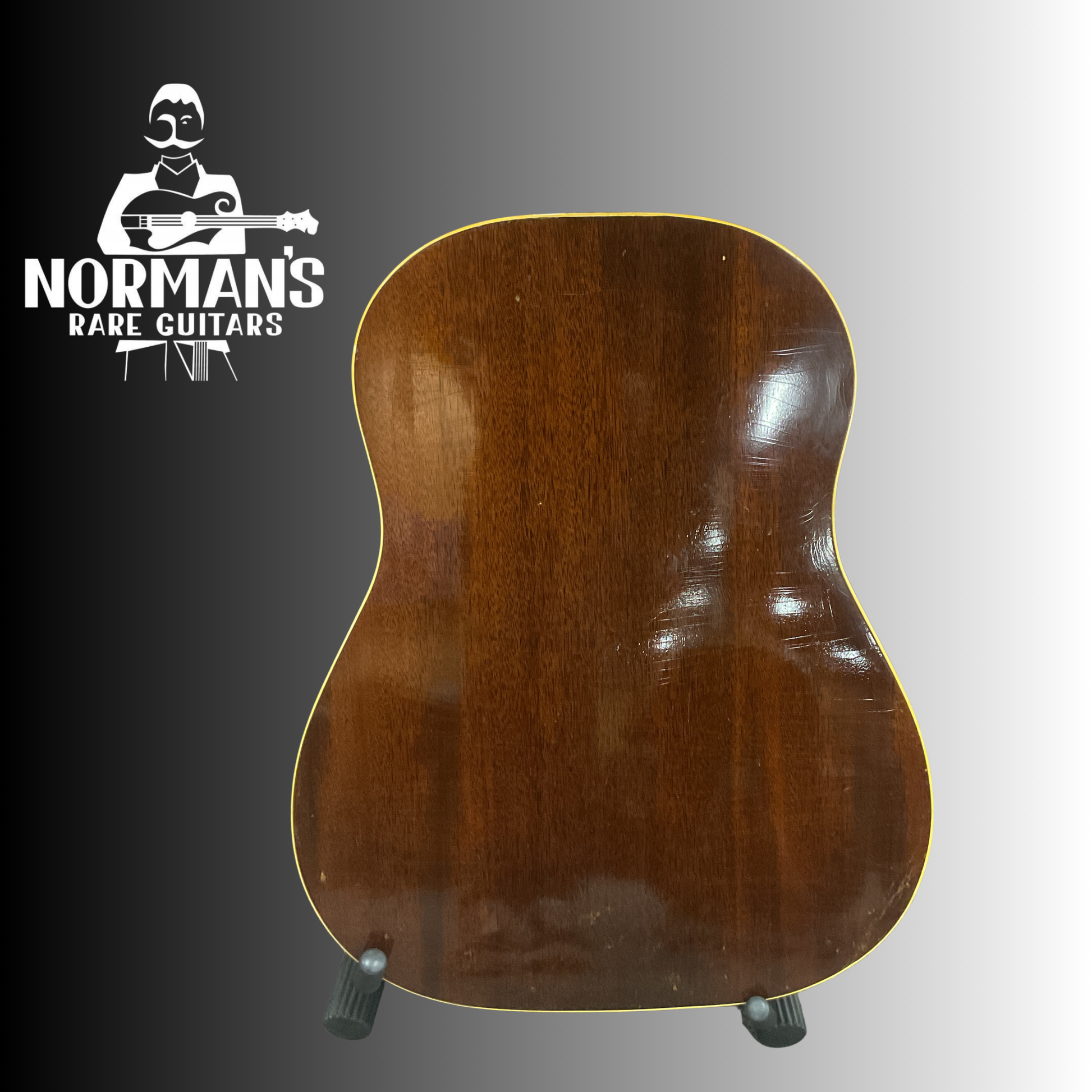 This guitar comes w/ hard shell case, original single line 3 on a plate Kluson deluxe tuning machines, original ADJ bridge, ABS plate w/ minor glued cracks, original ceramic saddle, original frets, spruce top, mahogany back & sides, mahogany neck, rosewood fingerboard, minor hairline finish cracks above the sound hole, fingerboard radius, 12", weight 4.4 lbs, condition is very good -- see pics for more details.