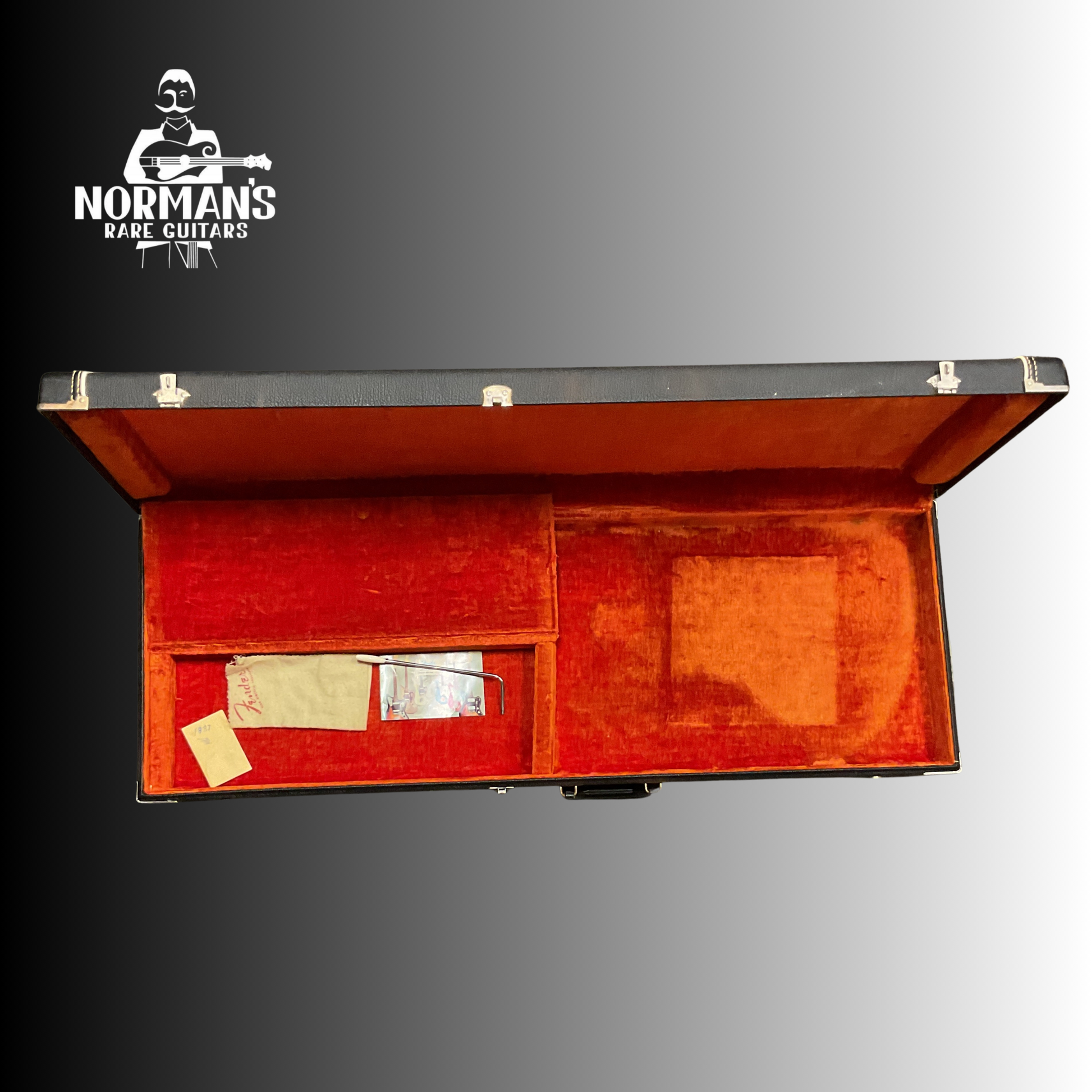 This guitar comes with the original hardshell case, tremolo bar & owners manuel, original double line Kluson deluxe tuning machines, original bridge, original frets, all original electronics, alder body, maple neck, Brazilian rosewood fingerboard (two factory shims & one non-original maple shim on the neck joint), 4MAY65B, original gray bobbin pickups, fingerboard radius 7 1/4", weight 8.0 lbs. Amazing condition! -- see pics for more details.