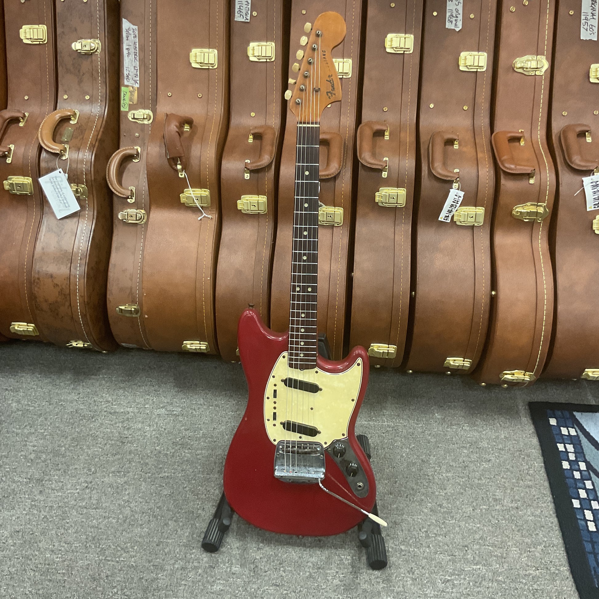 For sale is a 1966 Fender Mustang Dakota Red, original tuning machines, original bridge, original frets, original pots & capacitors, alder body, maple neck, rosewood fingerboard, 16MAR66B, original gray bobbin pickups, fingerboard radius 7 1/4", weight 7.28 lbs, condition is very good -- see pics for more details.