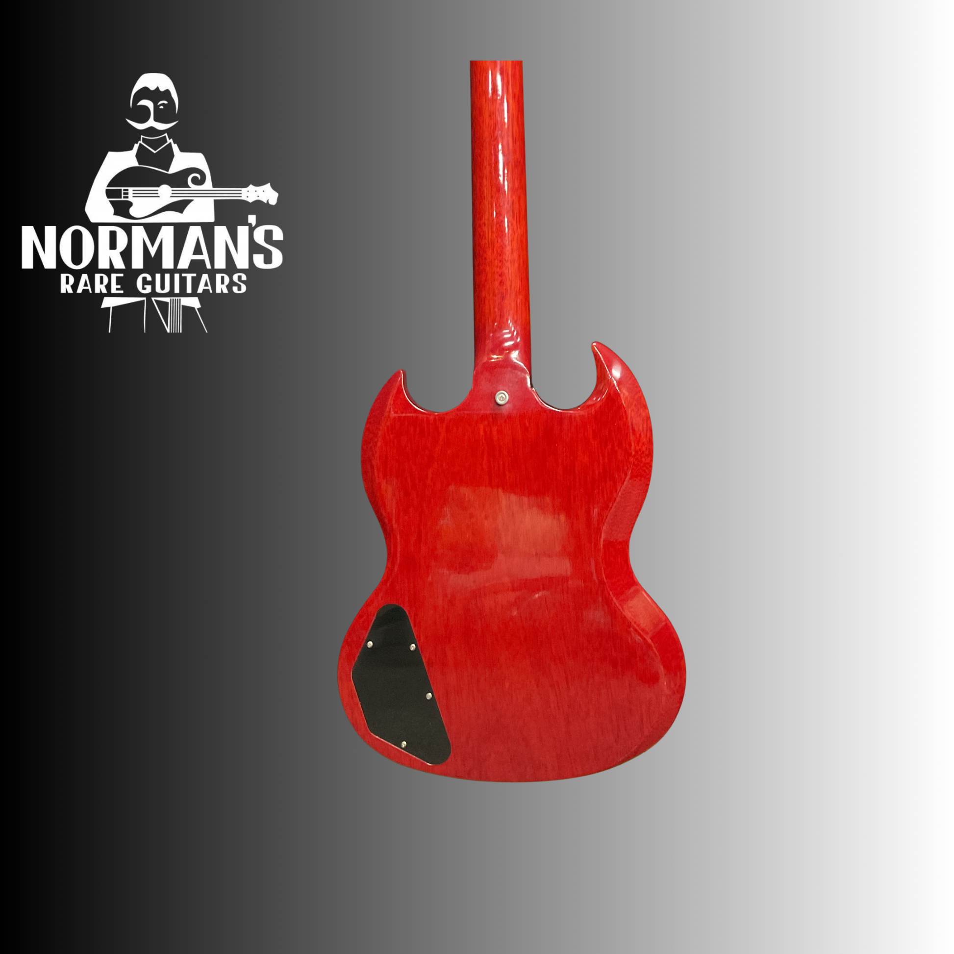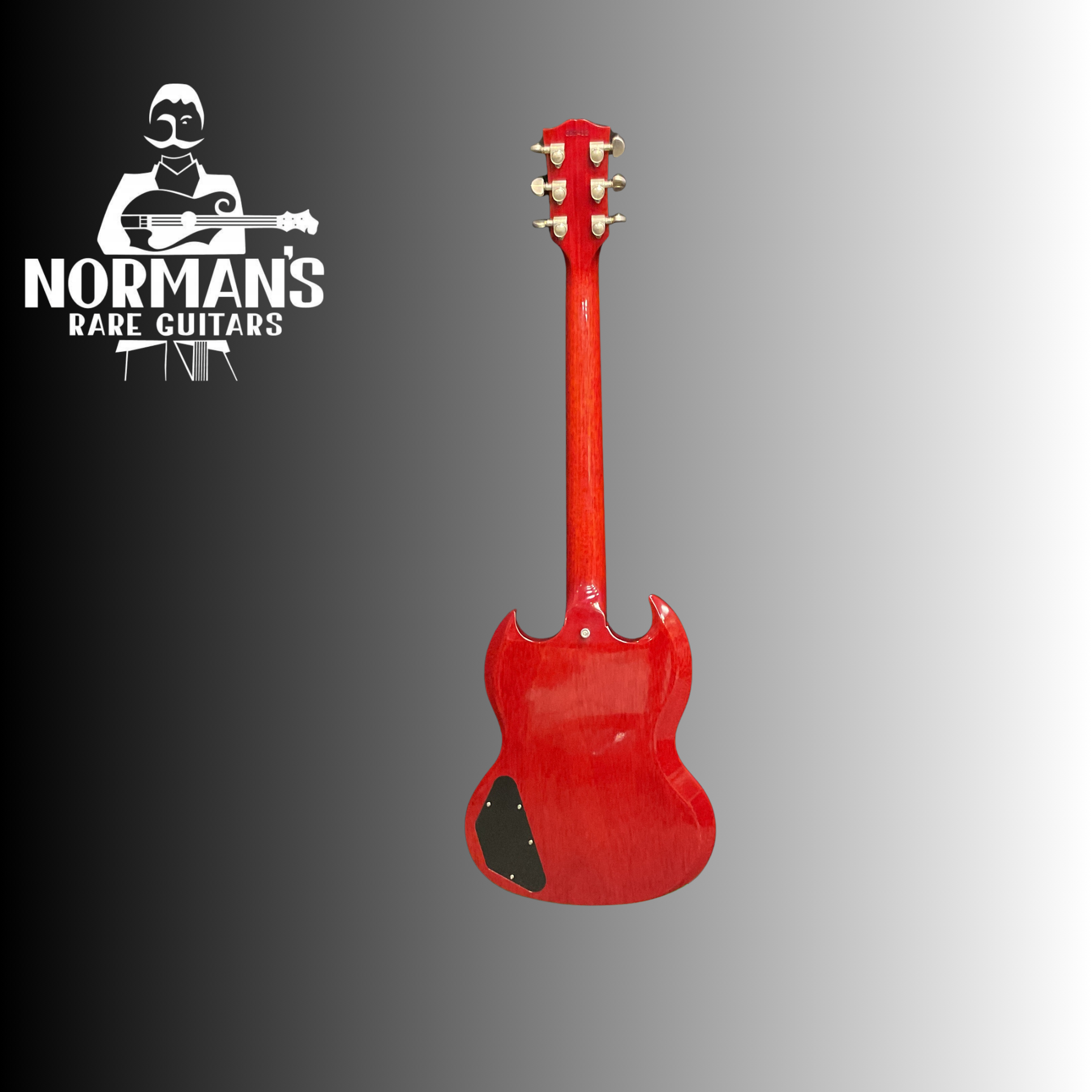 A 1990s Gibson Custom Art & History SG Les Paul Standard '61 Reissue Cherry is a reproduction of the original 1961 SG guitar, known for its vintage features like a mahogany body, SlimTaper neck, and small pickguard. The "Custom Art & History" part likely refers to the "Historic Collection," introduced in 1992, which focused on reissues that aimed for greater historical accuracy. These were made during the 1990s, with production starting around mid-1991.