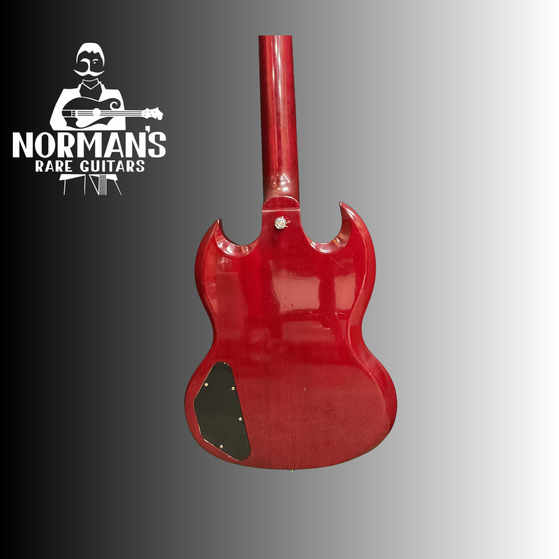 A 2008 Gibson SG Bass EB-3 Style Cherry is a specific model of a short-scale, double-cutaway electric bass guitar made by Gibson. It is a modern recreation of the classic 1960s EB-3 bass, featuring a mahogany body and neck, two humbucking pickups (a large one at the neck and a smaller one at the bridge), and a cherry finish. This particular 2008 version is a collector's item that can be recognized by its specific model year, but it is most famous for its role in popularizing the SG bass style through its use by rock legends.