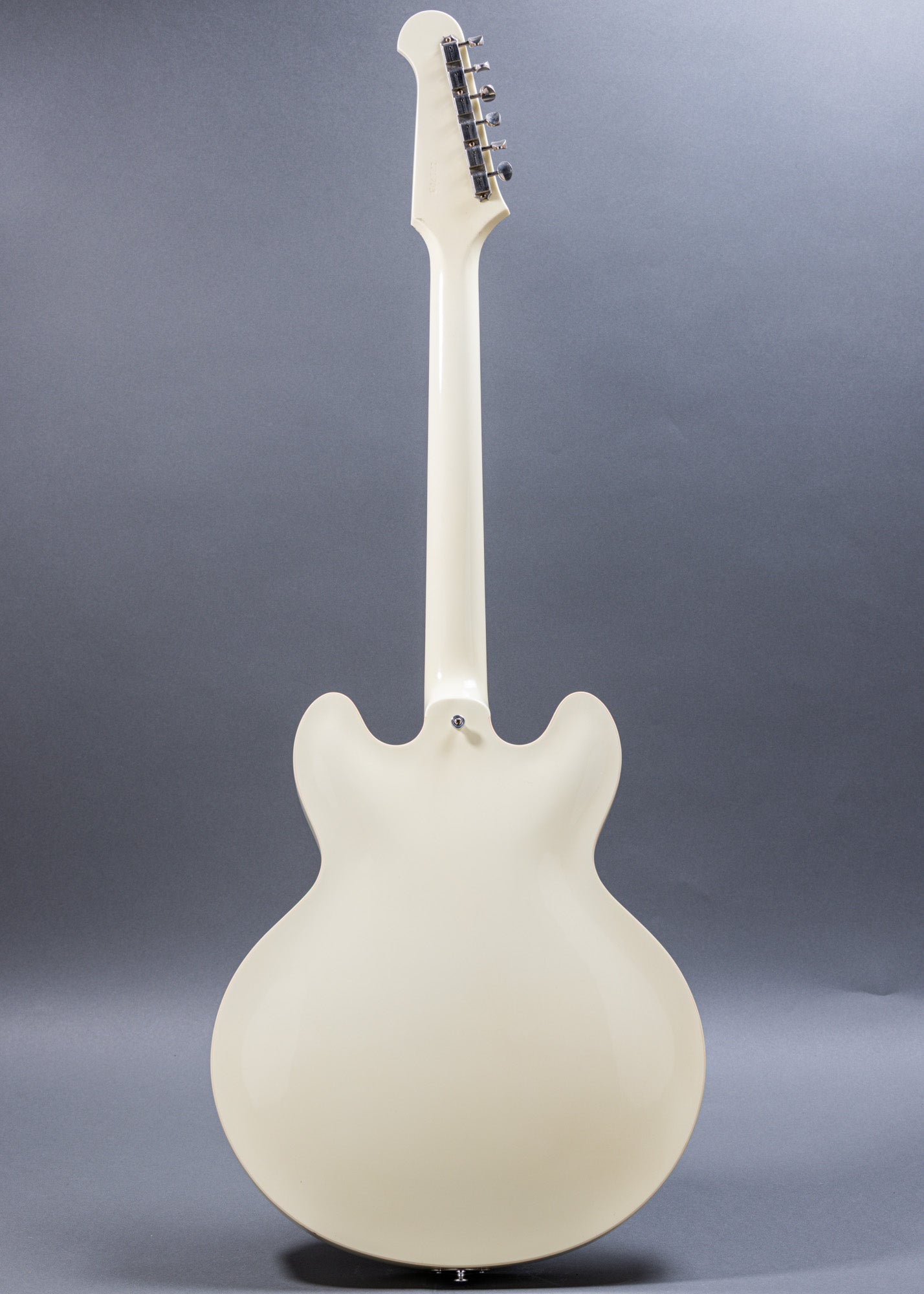 The Gibson Custom '64 Trini Lopez in Classic White is a premium, limited-edition reissue of the iconic 1960s semi-hollowbody model. Based on original 1964 specs, this guitar features distinctive diamond-shaped f-holes, a non-reverse Firebird headstock, and a unique trapeze tailpiece with a Trini Lopez insert. While the original ran from 1964–1971, these modern Custom Shop reissues were produced recently (e.g., 2021–2025) in limited, often dealer-exclusive batches. Production numbers for specific white-finished reissues are low and generally considered highly collectible, often featuring Murphy Lab aging. Comes with the OHSC.