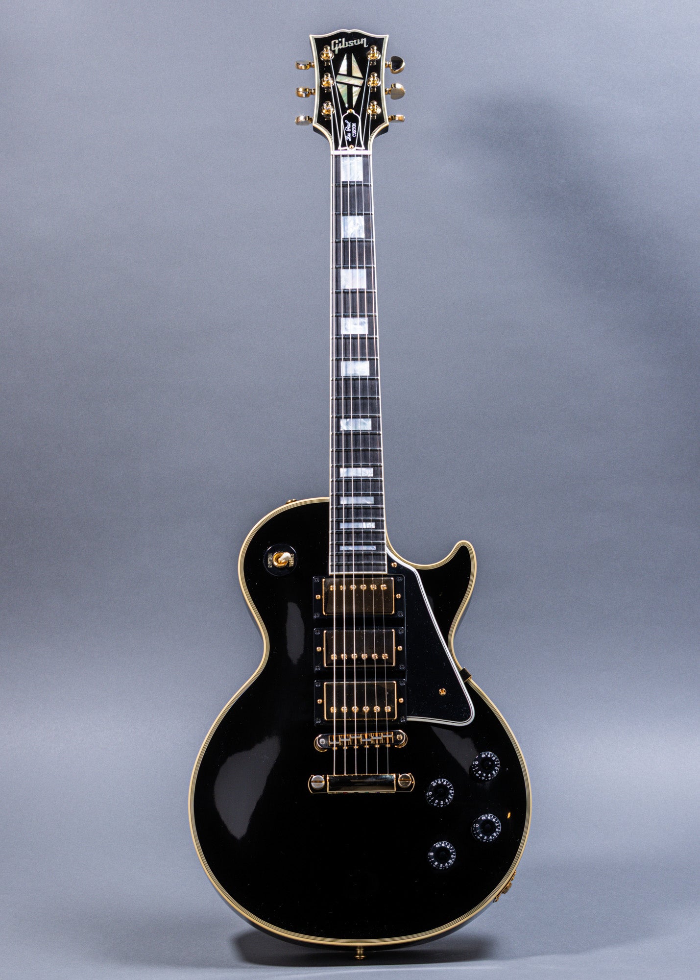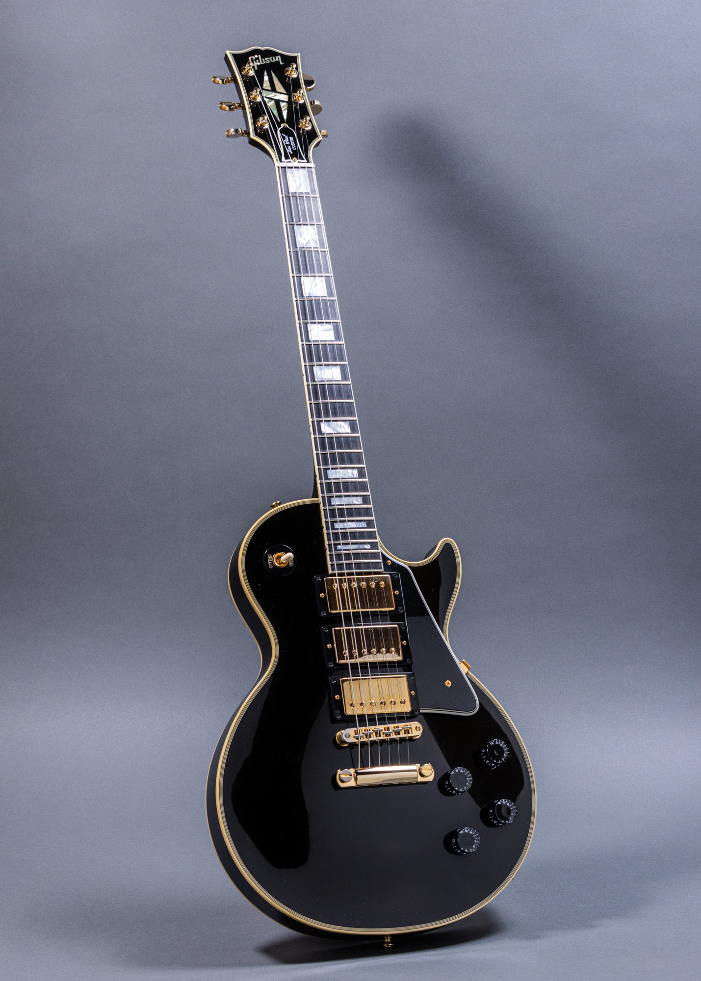 The Gibson Custom Shop 1957 Les Paul Custom Reissue in Ebony with three pickups is the "Black Beauty" at its most opulent. Featuring a solid mahogany body and carved mahogany top (historically accurate for 1957), it produces a warm, mid-forward growl. Three Unpotted Custombucker pickups offer a unique middle-position blend, while gold hardware, multi-ply binding, and an ebony fingerboard with block inlays provide unmatched elegance. This "Fretless Wonder" recreation is the definitive statement of 1950s luxury and rock-and-roll power.Based on serial CS 301879, your guitar was manufactured in 2023 in Nashville, Tennessee. Approximately 800 to 1,200 three-pickup Customs are produced annually by the Custom Shop.