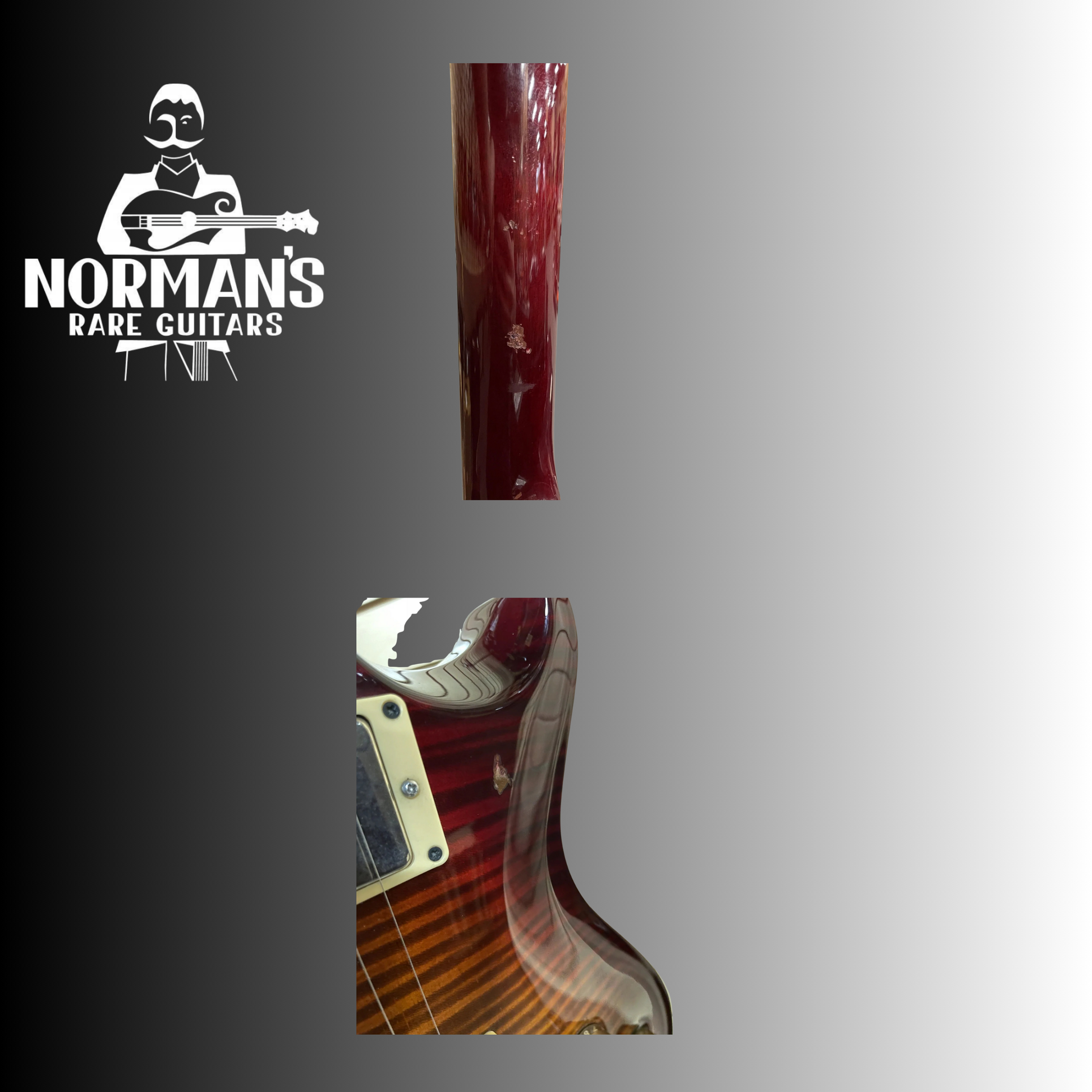 A PRS Singlecut 10 Top Amber is a solid-body electric guitar model by Paul Reed Smith, made in the United States. The "10 Top" designation means it has a premium, high-quality maple top, and "Amber" refers to its sunburst-style finish. This specific model was made between 2000 and 2007, though exact production years vary between different versions and sub-models, such as the Singlecut Tremolo which was made between 2004 and 2008.