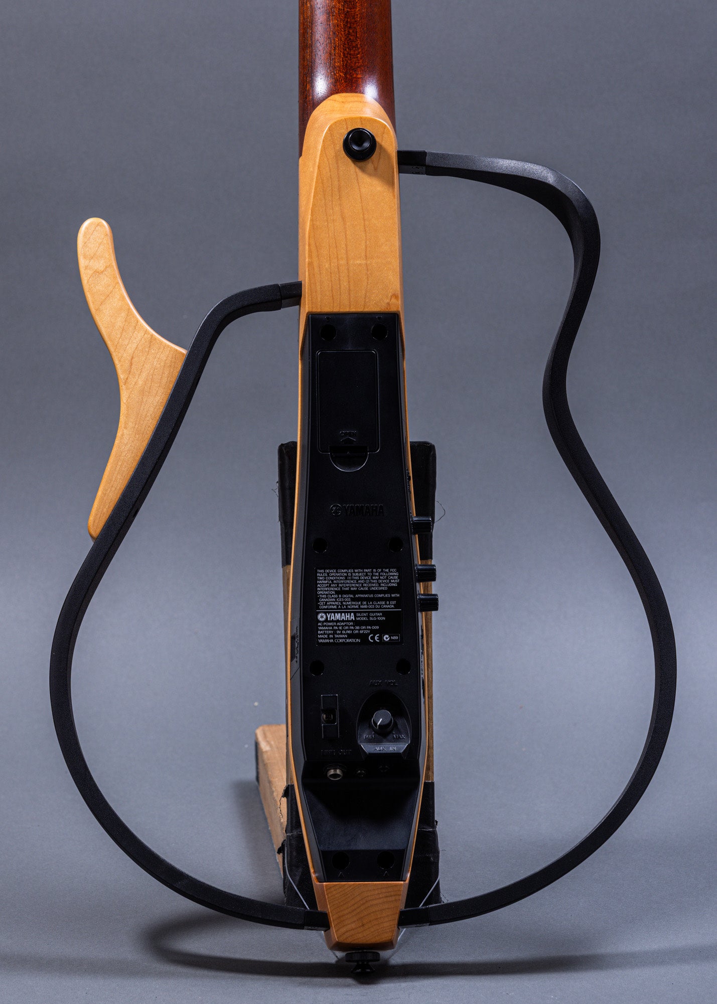 The Yamaha SLG-100N is a nylon-string acoustic-electric guitar designed for practice and performance that has a solid body and no soundhole, making it nearly silent when unplugged. It was launched in early 2002 and was developed by Yamaha to address issues like feedback and noise.